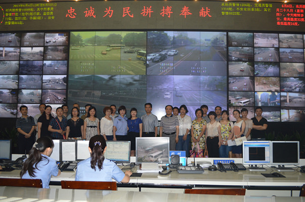 接著大家來到鐫刻有“忠誠為民、拼搏奉獻(xiàn)”字樣的全市交通路況顯示屏前。大屏幕上顯示著鄭州市各個(gè)主要單位、部位和重要道路交叉路口的即時(shí)信息,具有GPS定位功能的警車在不停地移動(dòng),視頻畫面依序切換,“原來每時(shí)每刻都有幾百輛警車在街面巡邏,每個(gè)路口都有監(jiān)控。看樣子,鄭州市的安保工作還是有保障的,以后更要規(guī)范自己的言行,遵守交通規(guī)則”大家很是感慨。