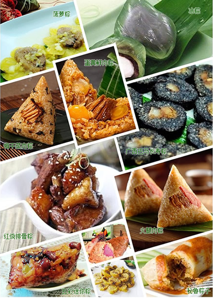 如今的粽子更是多種多樣,璀璨紛呈?,F(xiàn)今各地的粽子,一般都用箬殼包糯米,但內含的花色則根據(jù)各地特產(chǎn)和風俗而定,著名的有桂圓粽、肉粽、水晶粽、蓮蓉粽、蜜餞粽、板栗粽、辣粽、酸菜粽、火腿粽、咸蛋粽等等。