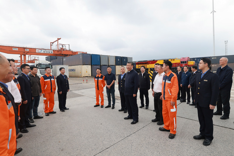 4月22日至24日,中共中央總書記、國家主席、中央軍委主席習近平在重慶考察。這是22日下午,習近平在重慶國際物流樞紐園區(qū)重慶鐵路集裝箱中心站,同貨車司機、列車司機、裝卸工人、場站管理人員等親切交流。新華社記者 王曄 攝