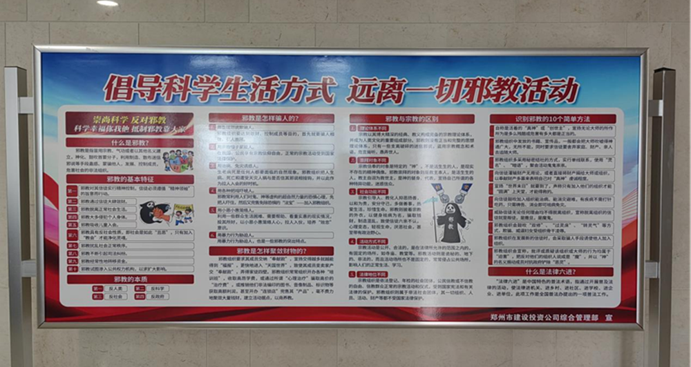 為了進(jìn)一步提高國(guó)企員工反邪教意識(shí),認(rèn)識(shí)邪教的危害,切實(shí)增強(qiáng)自覺(jué)抵御邪教侵蝕的能力,營(yíng)造積極向上、健康和諧的工作氛圍。4月25日下午,鄭州市建設(shè)投資集團(tuán)有限公司組織全體干部員工開(kāi)展反對(duì)邪教宣傳活動(dòng)。利用PPT宣講、宣傳展板、網(wǎng)站、懸掛橫幅等方式,向員工宣傳邪教的種類(lèi)、危害和邪教組織的種類(lèi)等,引導(dǎo)國(guó)企干部職工認(rèn)清邪教本質(zhì),提高識(shí)邪、防邪、拒邪能力,筑牢反邪教思想防線(xiàn),做到對(duì)邪教歪理邪說(shuō)不聽(tīng)、不看、不信、不傳。