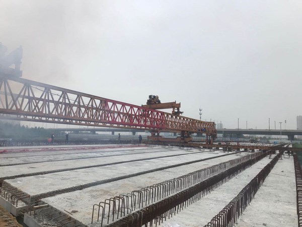 該橋橋梁斷面采用兩幅橋形式,橋梁全寬50.6米,全長(zhǎng)184.2米。針對(duì)橋梁施工范圍內(nèi)涉及地鐵4號(hào)線盾構(gòu)頂進(jìn)和賈魯河綜合治理等多部門多作業(yè)施工,我公司邀請(qǐng)了省內(nèi)知名專家進(jìn)行專項(xiàng)方案評(píng)審把關(guān)。在建設(shè)過(guò)程中,精心組織,統(tǒng)籌協(xié)調(diào),克服了現(xiàn)場(chǎng)條件復(fù)雜、汛期施工難度大等不利因素的影響,抓質(zhì)量,促進(jìn)度,保安全,順利地實(shí)現(xiàn)了橋梁合龍這一關(guān)鍵節(jié)點(diǎn)。